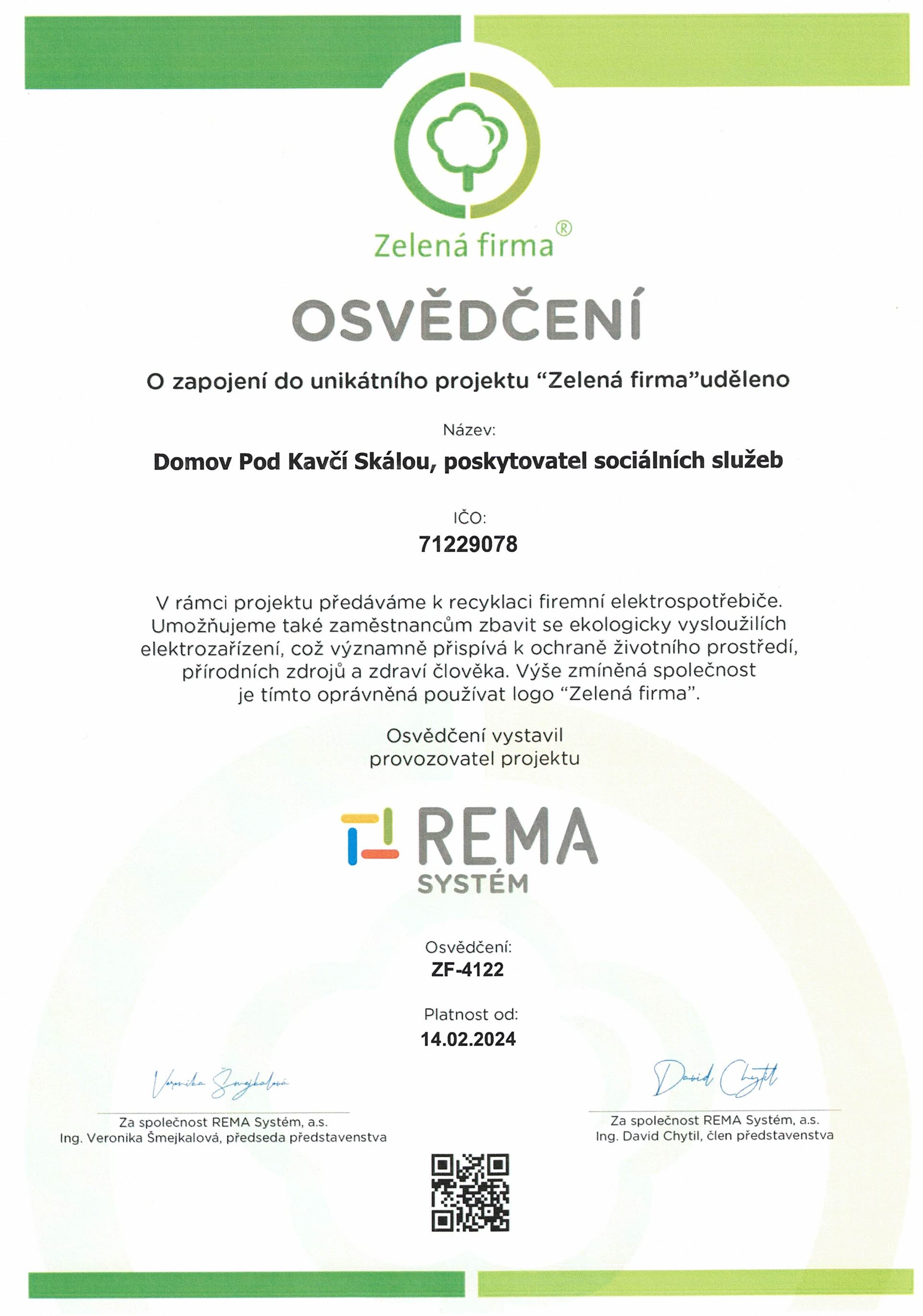 Naše společnost se zapojila do projektu Zelená firma a umožňuje tak svým zaměstnancům bezplatně odevzdat vysloužilá elektrozařízení, baterie a akumulátory. Zároveň je tím bez nutnosti cesty na speciální místo zpětného odběru podporujeme v ekologickém chování a s tím související recyklací, při které se mění odpad na znovu použitelný materiál. Vysloužilé elektrospotřebiče z domácností a baterie mohou zaměstnanci jednoduše odkládat do sběrného boxu, který je umístěn při vstupu do zařízení.