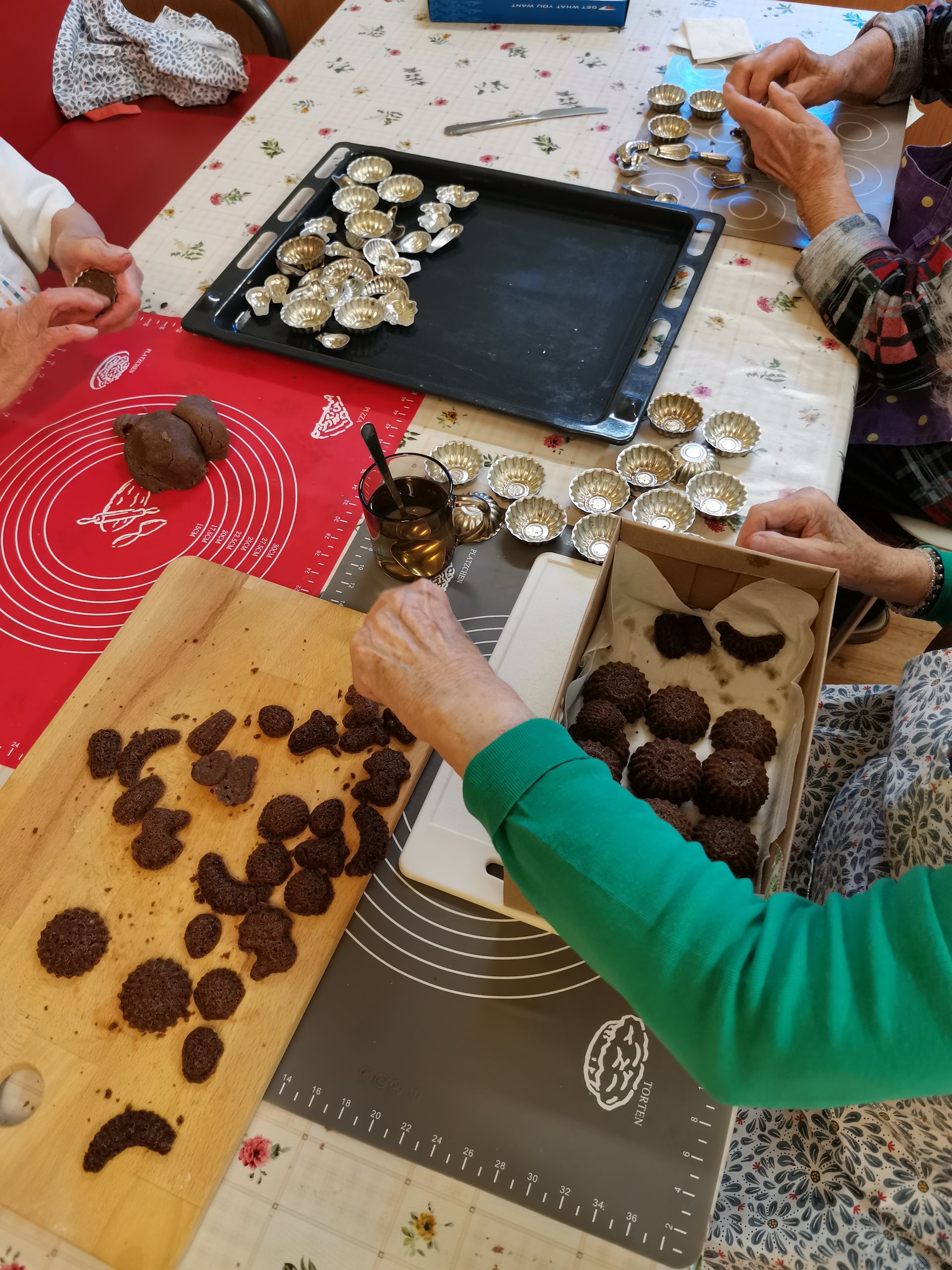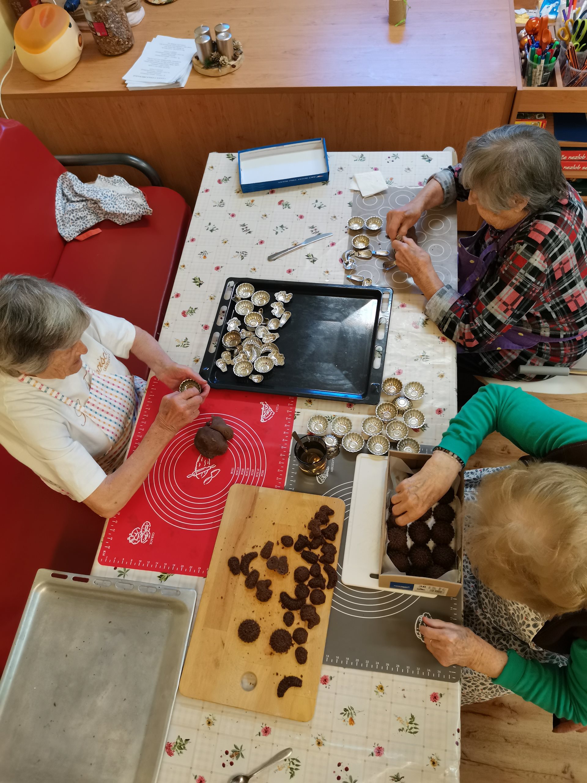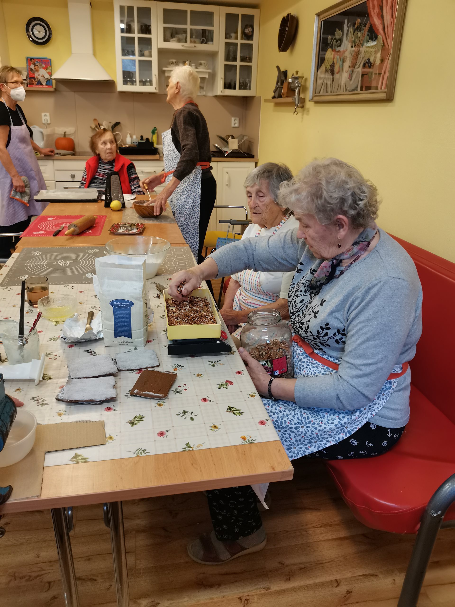 Zapojilo se hodně klientů, vůně vanilky, hřebíčku a skořice linoucí se po chodbách domova přilákala pozornost. Každý dělal, nač mu síly stačily. Někdo vymačkával pracny, někdo je vyklápěl z formiček a jiný skládal do krabičky na uchování do vánoc. Upekli jsme si i něco na zub (jablečné hraběnčiny řezy) a začali jsme s vyráběním perníkových chaloupek. Tak kolik jich letos poskládáme? :-)