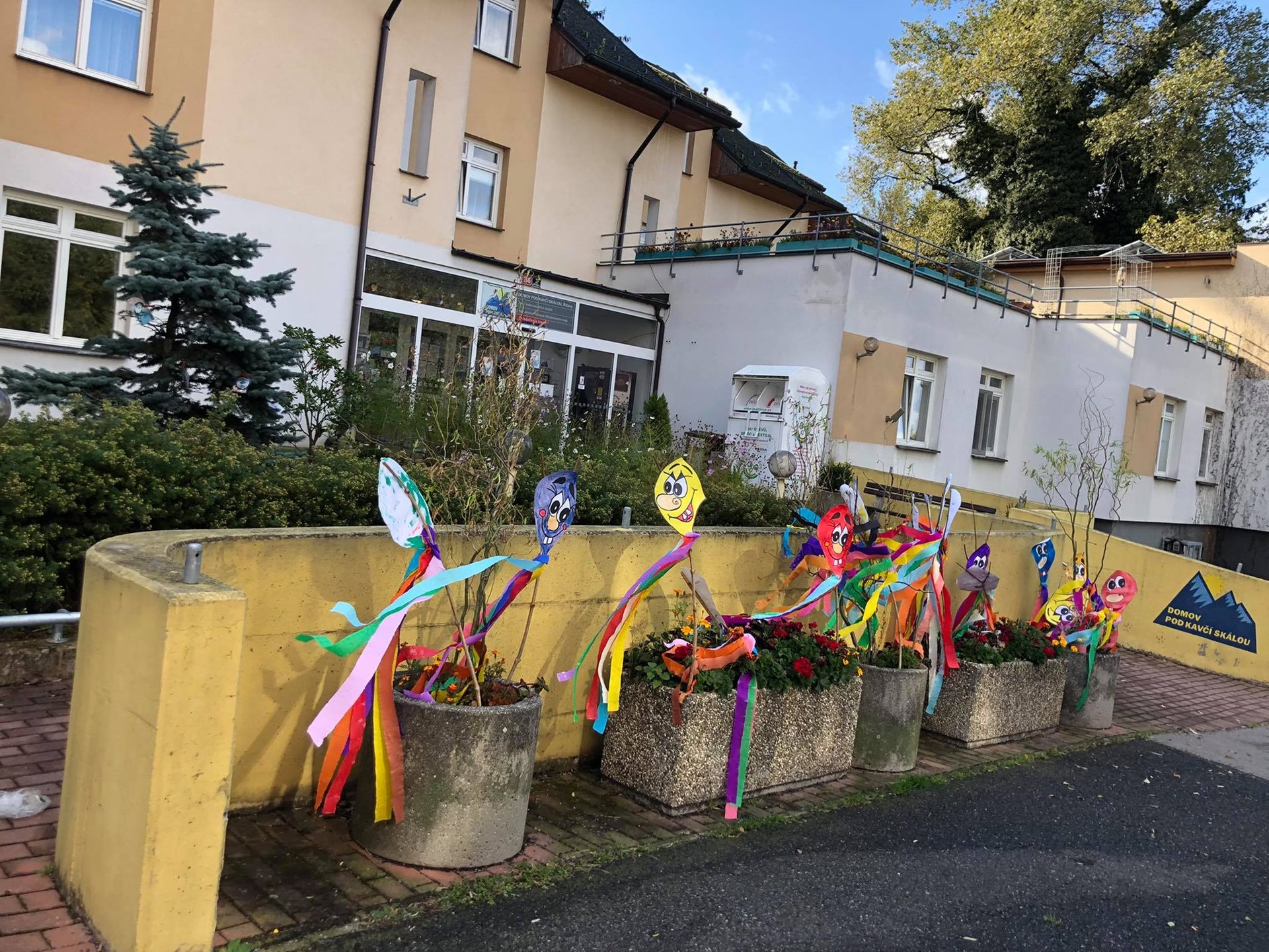 Radost byla vzájemná a veliká. Poté, co jsme si na louce společně zařádili, přesunuli jsme se k branám našeho Domova, kde v truhlících před vstupem našli dráčci svoje bydlení. :-) Přinesli tak barevnou radost kolemjdoucím i klientům, kteří se nemohli či nechtěli Drakyády zúčastnit. Odpoledne se dráčci přestěhovali do vnitřních společných prostor, aby nám je déšť nerozmáčel.
