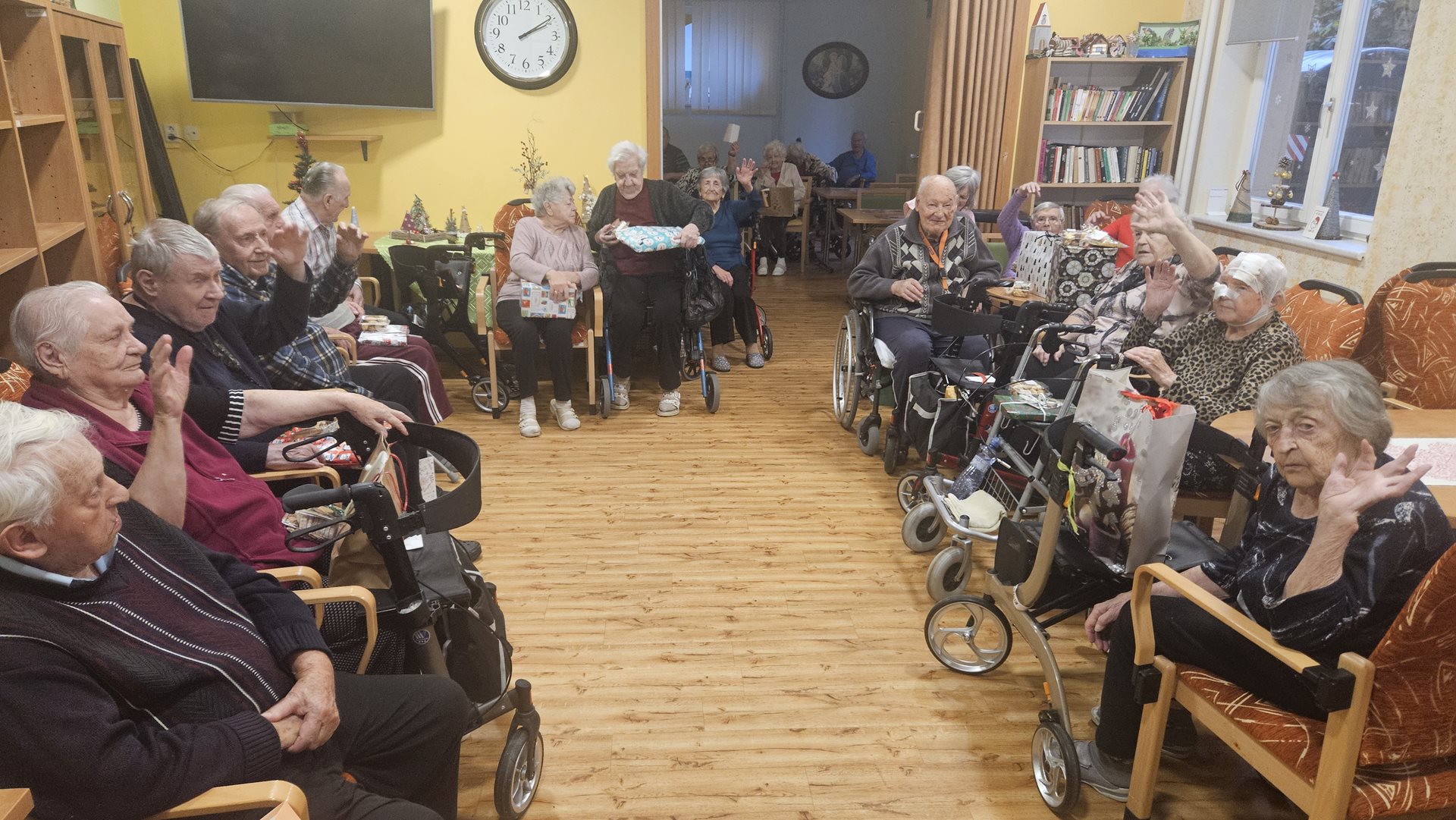 Dva dny před Štědrým dnem jsme tak mohli uspořádat odpolední setkání s názvem Ježíškování s Fialkou a všem našim 55 obyvatelům předat krásně zabalené vánoční dárky přesně dle jejich přání.