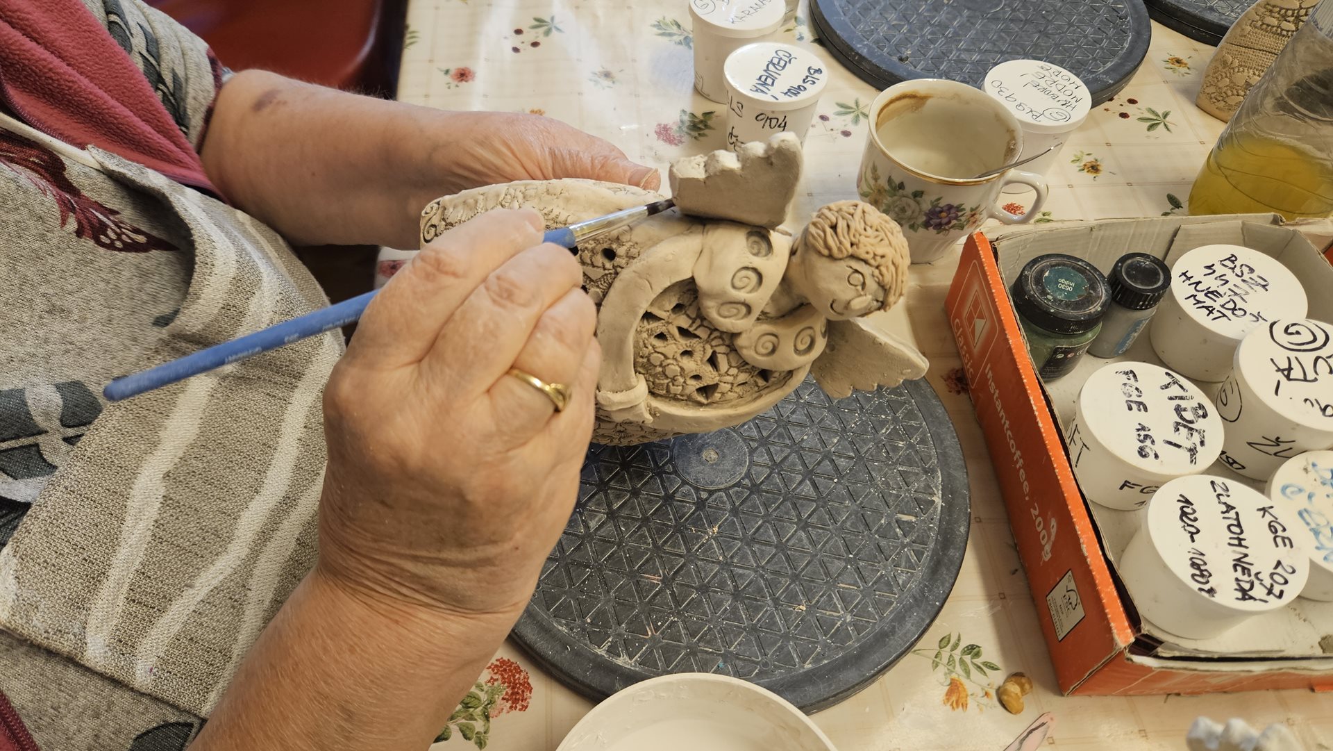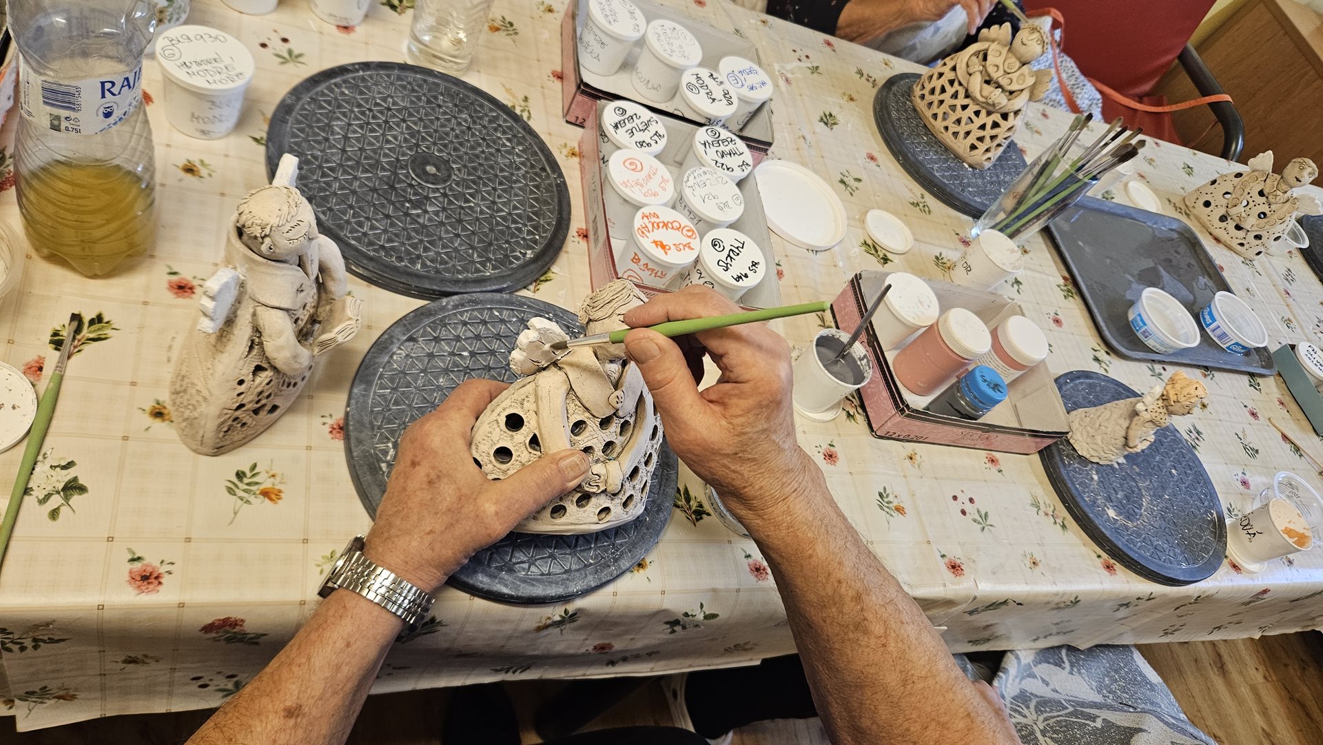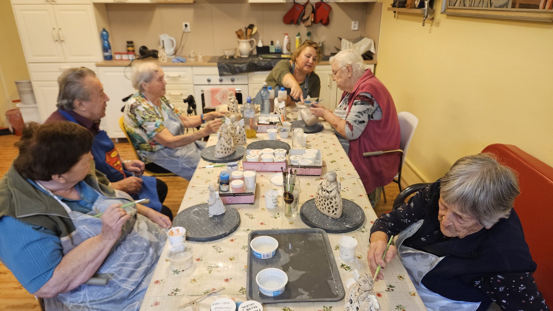 Keramickou dílnu otevíráme pravidelně 2-3 krát do měsíce a schází se nám v ní už ustálený počet nadšenců. Pod vedením zkušené výtvarnice Romany vznikají dílka, která by si právoplatně zasloužila místo na stáncích vánočních trhů. A tak jsme dostali nápad. Jeden takový si v prosinci uděláme. A představíme tam nejen výrobky z keramiky, ale i z ostatních výtvarných kroužků a aktivit. Z korálkování, z háčkování, z kuchyně. A tak se na to se začínáme se vší vervou chystat. A klienti se těší, že výsledky jejich práce při hodinách aktivizace uvidí nejen jejich spolubydlící a rodinní příslušníci, ale i zaměstnanci, děti a rodiče z mateřské školky, naši podporovatelé z Centra Na Fialce i z města Říčany a lidé z blízkého okolí. Sledujte náš web. S termínem za Vámi brzy přijdeme.