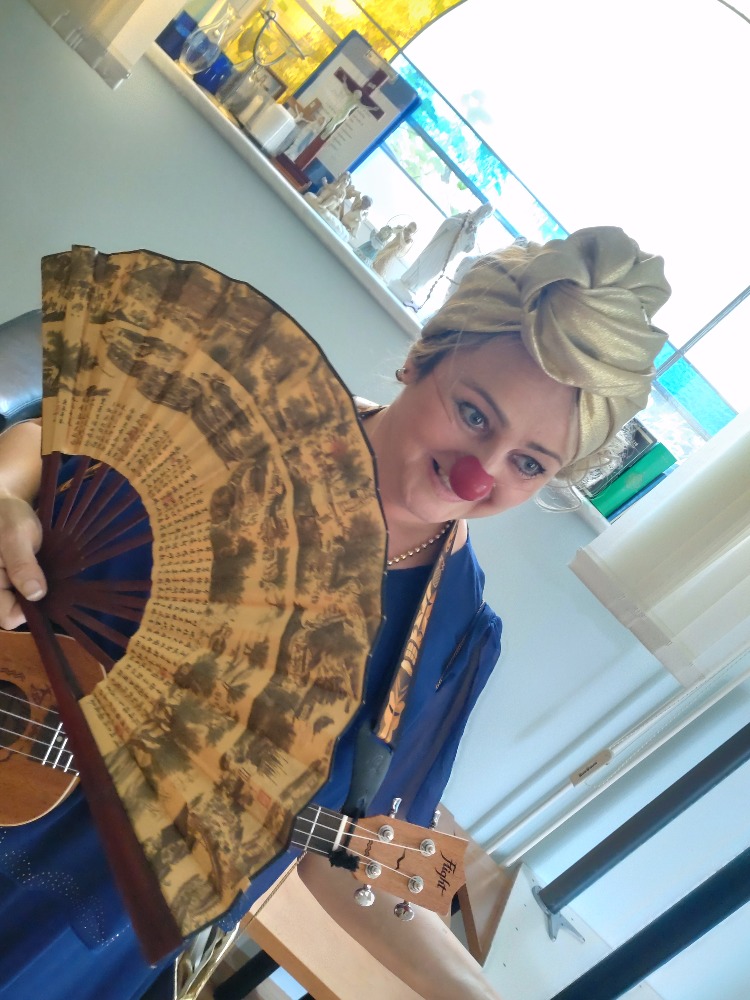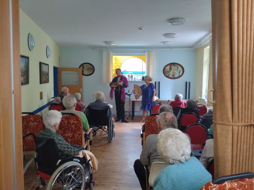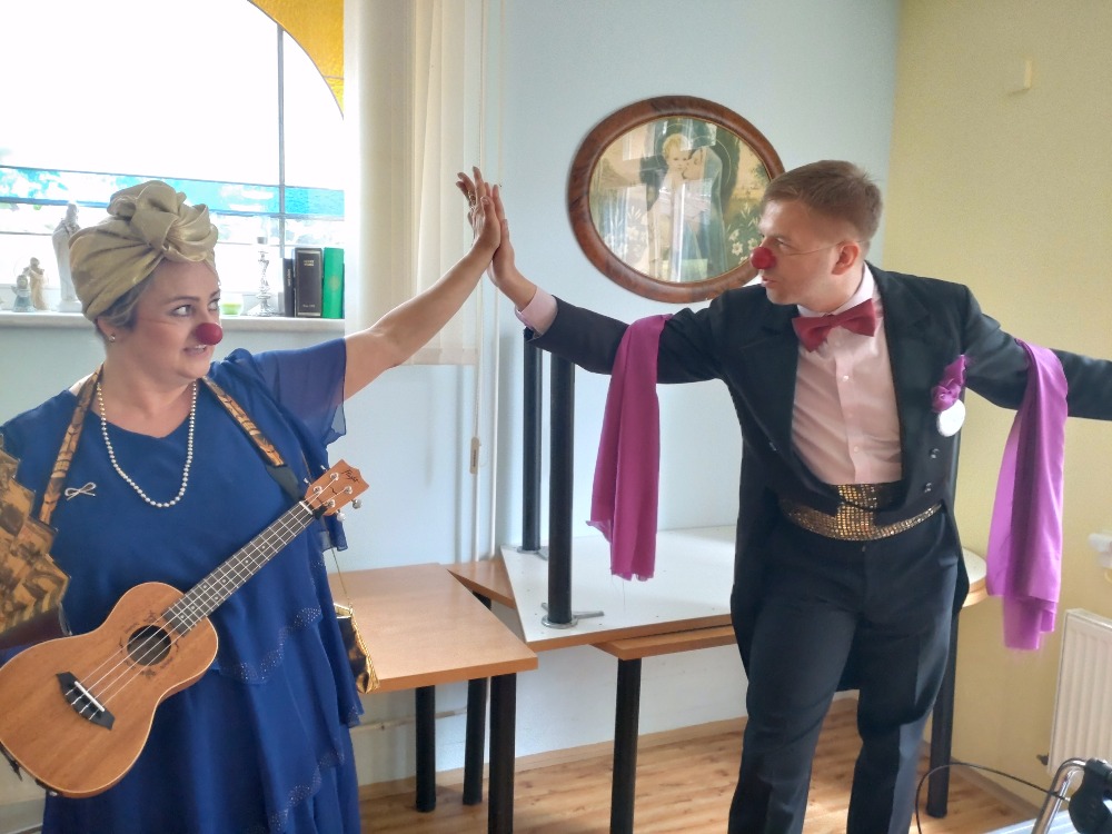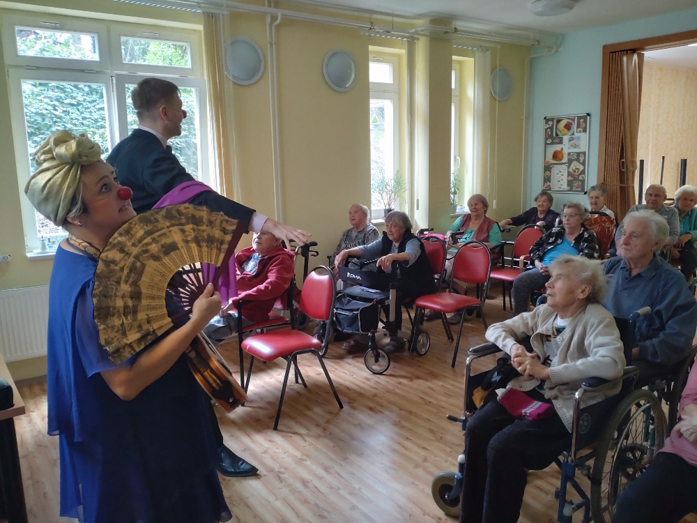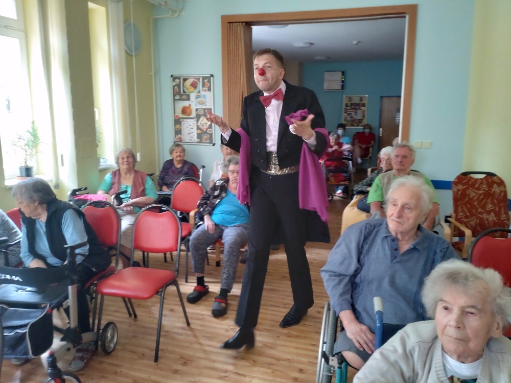 Nejprve vystoupení pro mobilní klienty ve společenské místnosti, potom individuální návštěva na pokojích. Legrace, smích, pohoda. Zavzpomínání na staré písničky, společné zpívání a spousta vtipu a dobré nálady. Takové bylo i tentokrát vystoupení Zdravotních klaunů u nás v zařízení.