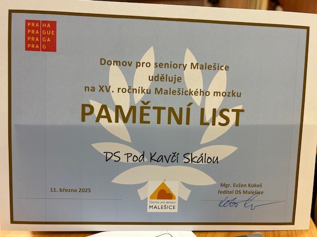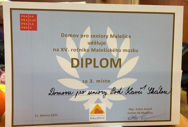 Dne 11. 3. se konal 15. ročník soutěže mezi Domovy pro seniory ve cvičení paměti „ MALEŠICKÝ MOZEK“. Jako již tradičně, rádi jsme přijali pozvánku na tuto výzvovou akci a sestavili i náš tým. Účastnilo se celkem 8 domovů. Soutěžící, kteří reprezentovali náš Domov, poctivě trénovali a dali si skutečně záležet. Potili nad úkoly krev skoro 2 hodiny. Účastníci řešili sadu úkolů, které byly zaměřené na pozornost, krátkodobou i dlouhodobou paměť, verbální a logické dovednosti. Máme nesmírnou radost, že hned takto z kraje závodní sezóny se našemu družstvu podařilo vybojovat krásné 3. místo. Vzhledem k tomu, že pořadatelé hodnotí nejenom týmové výkony, ale i výkony jednotlivců, přivezli jsme medailí více. V kategorii účastníků nad 80. let jsme získali druhé místo a v kategorii pod 80 let rovněž tak. Velice gratulujeme a děkujeme za skvělou reprezentaci našeho Domova.
