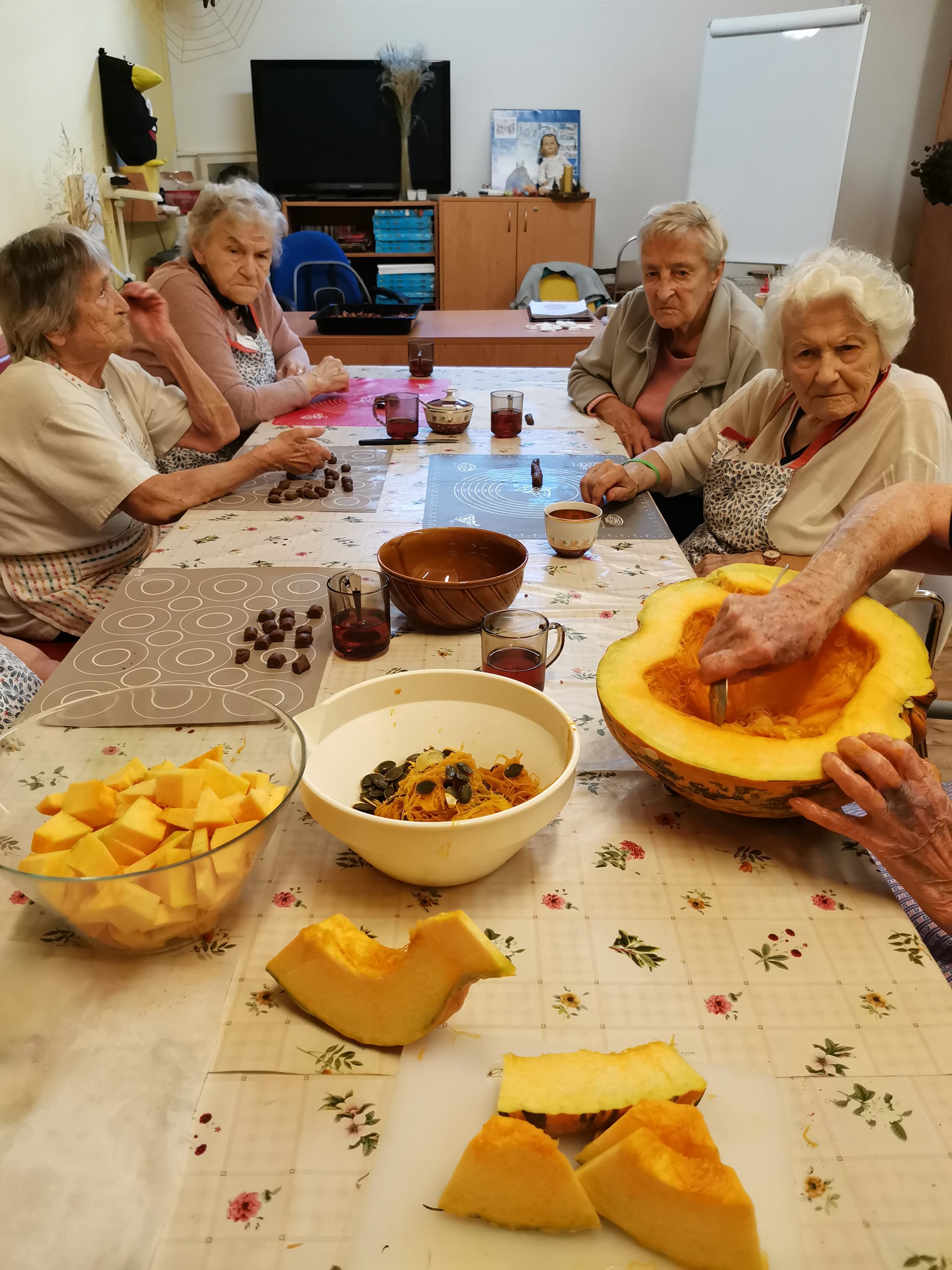 To se tak stane, že nám do Domova doputuje od laskavé aktivizační nálož dýní a skupinka obyvatel má chuť na pravou domácí dýňovou...... a protože nemají problém přiložit ruku k dílu, tak si ji prostě pro sebe i pro své spolubydlíci uvaří. Byla výborná. :-)