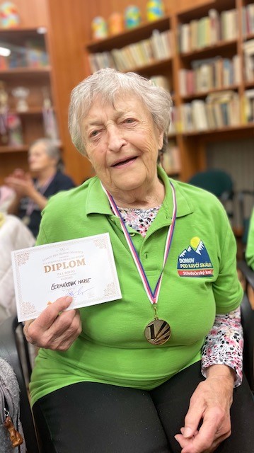 . Naše sportovkyně paní M.Č. vybojovala zlatou medaili v kuželkách. Gratulujeme.