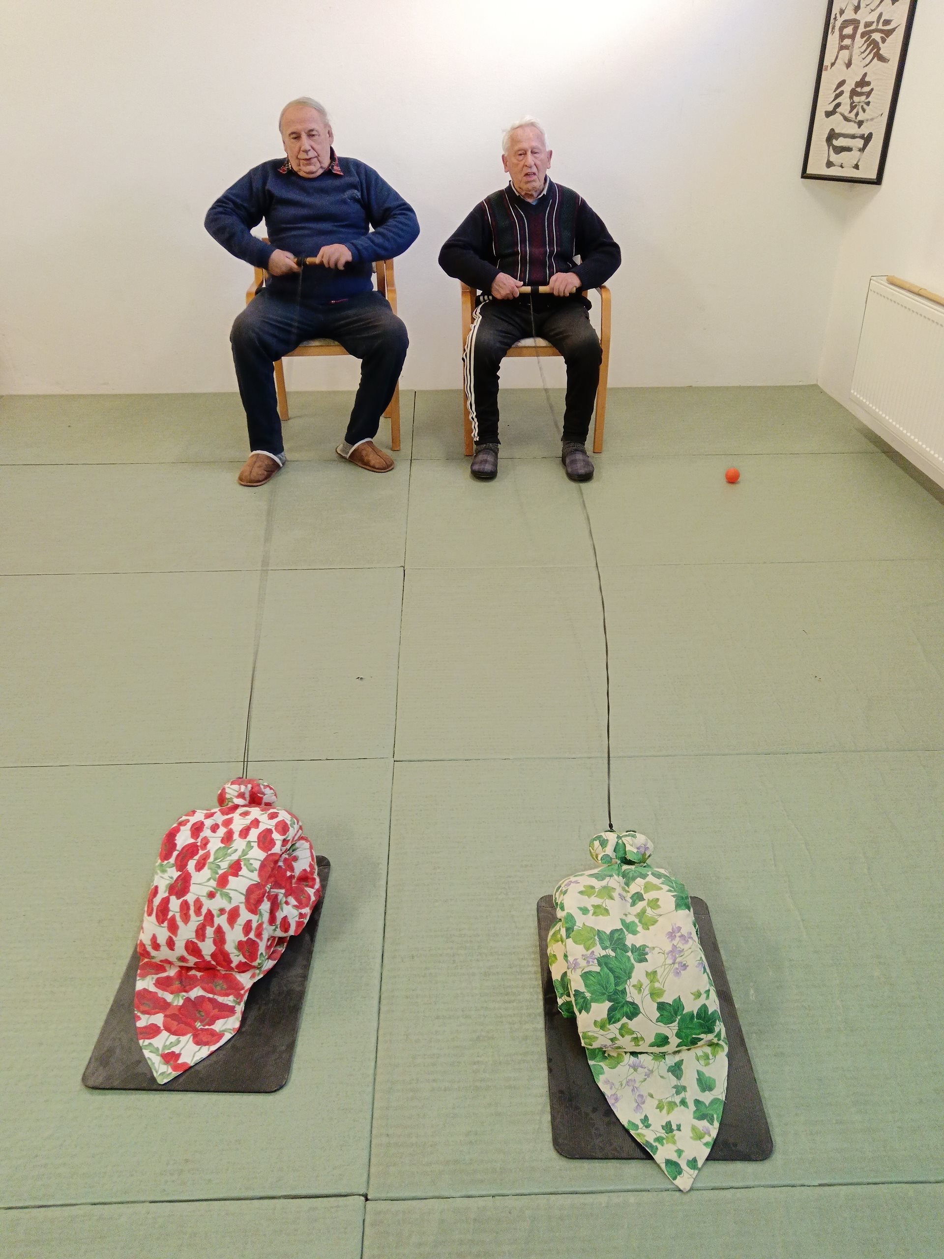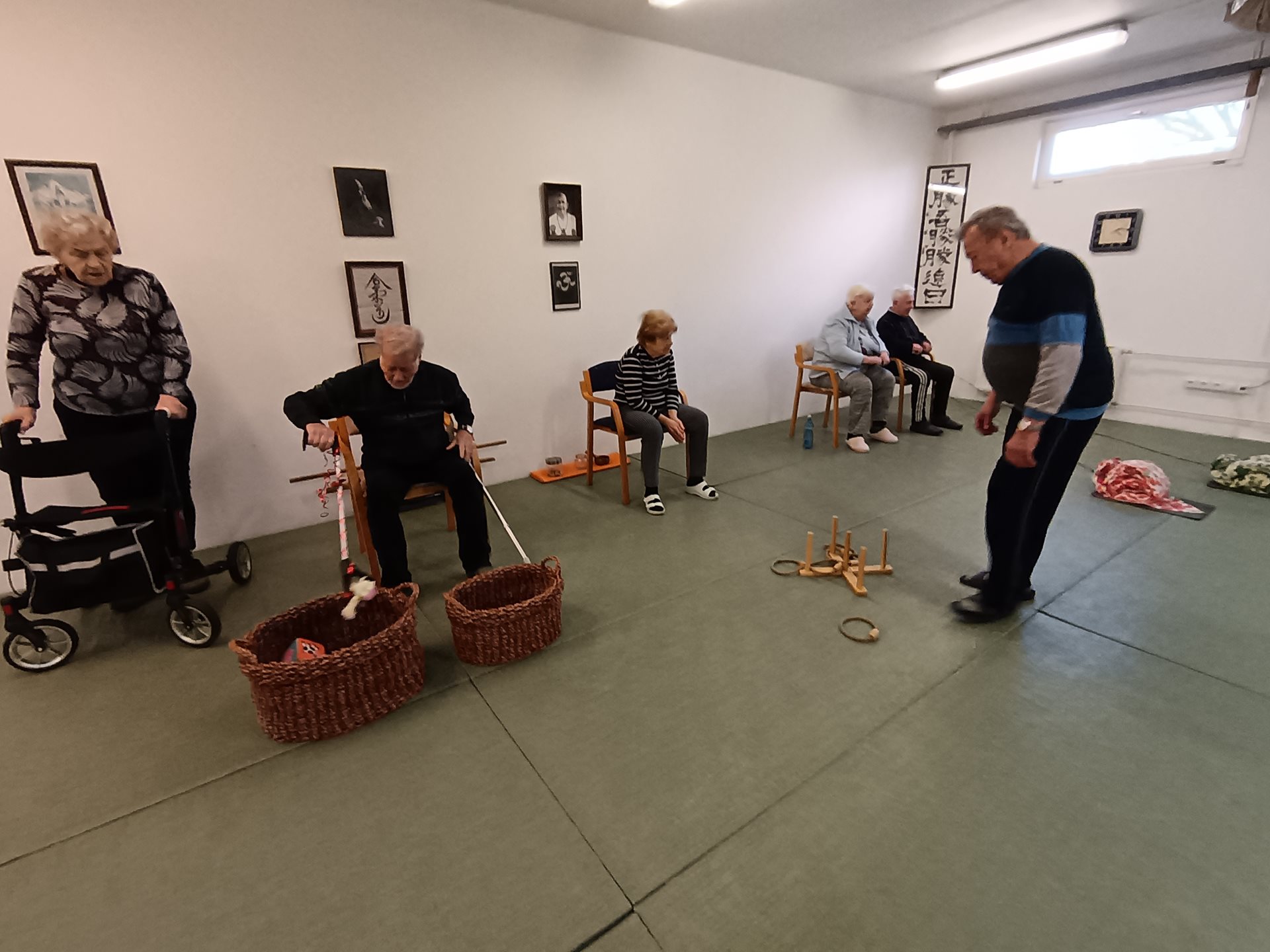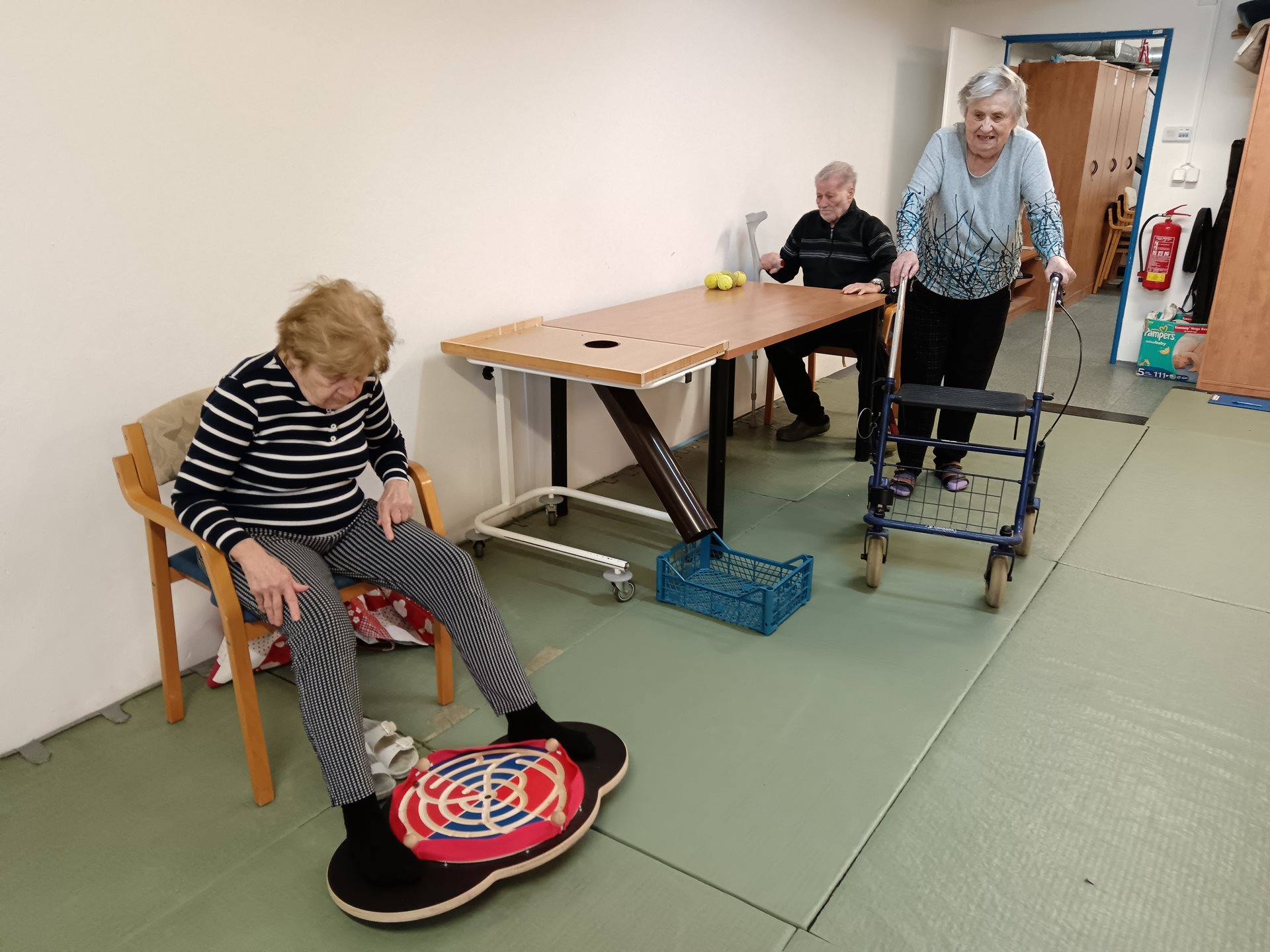 Domov po svátcích už zase jede ve svých běžných kolejích a na programu aktivizace se častěji objevují hodiny zaměřené na pohyb a fyzickou kondici. Tyto hodiny vede profesionální ergoterapeutka a tentokrát se zaměřila na jemnou práci rukou i nohou, na odhad vzdálenosti, míření na cíl a na úchopy.
