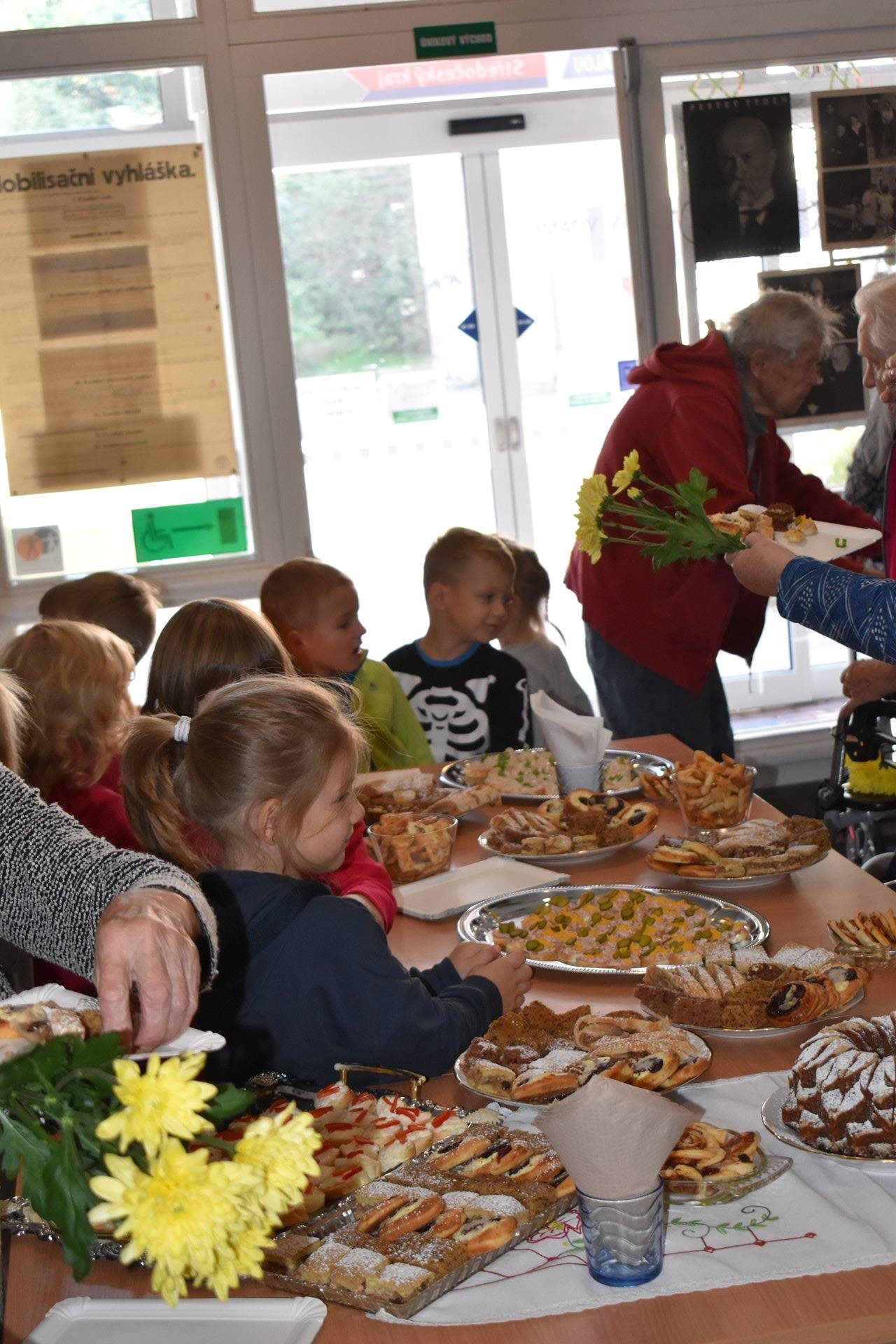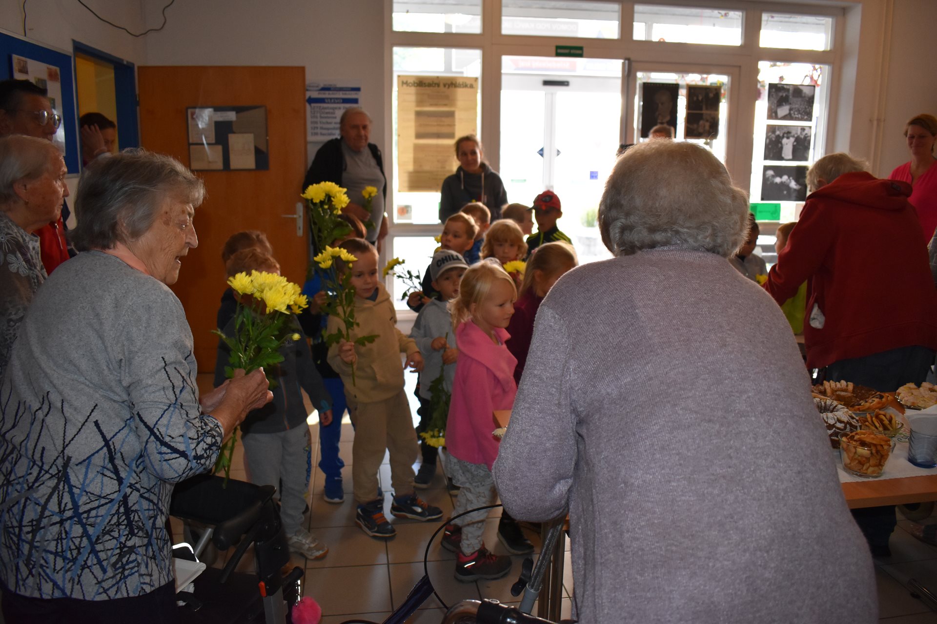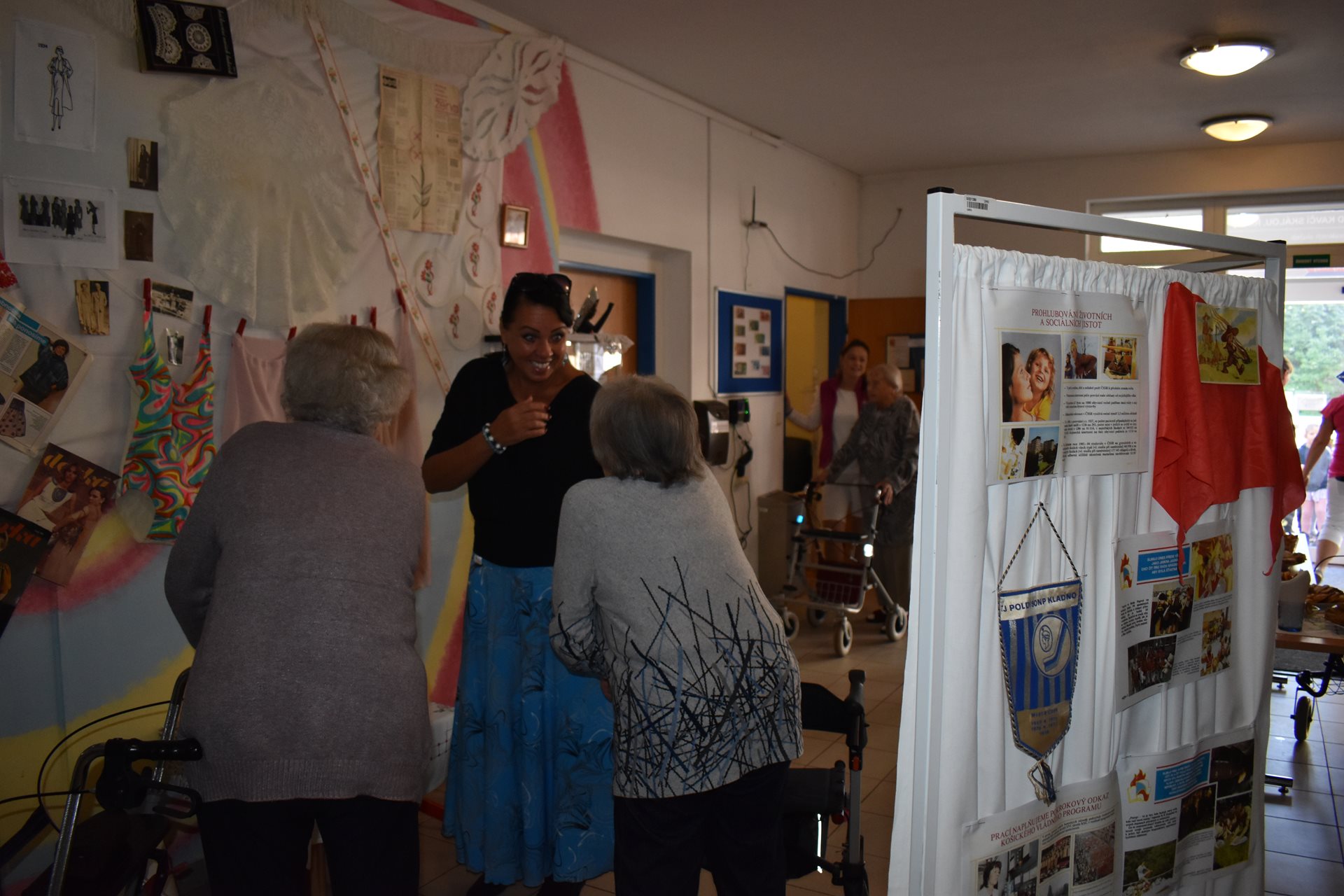 V pátek dopoledne jsme formou komorní vernisáže tuto výstavu otevřeli, pohoštění na vernisáž jsme připravili vlastními silami, sladké pečivo si obyvatelky napekly zcela samy. A těšily se myšlenkou, že mohou na slavnostní zahájení takto přispět. Pochutnali jsme si, společně zavzpomínali a pak nás navštívila paní učitelka Jana Michaličková se svou třídou Zajíčků a přinesla nám kytičkové pozdravy. My jsme na oplátku dětem na staré promítačce pustili Červenou Karkulku a ukázali jim, jak se to dělalo "tenkrát". Bylo nám společně moc hezky.