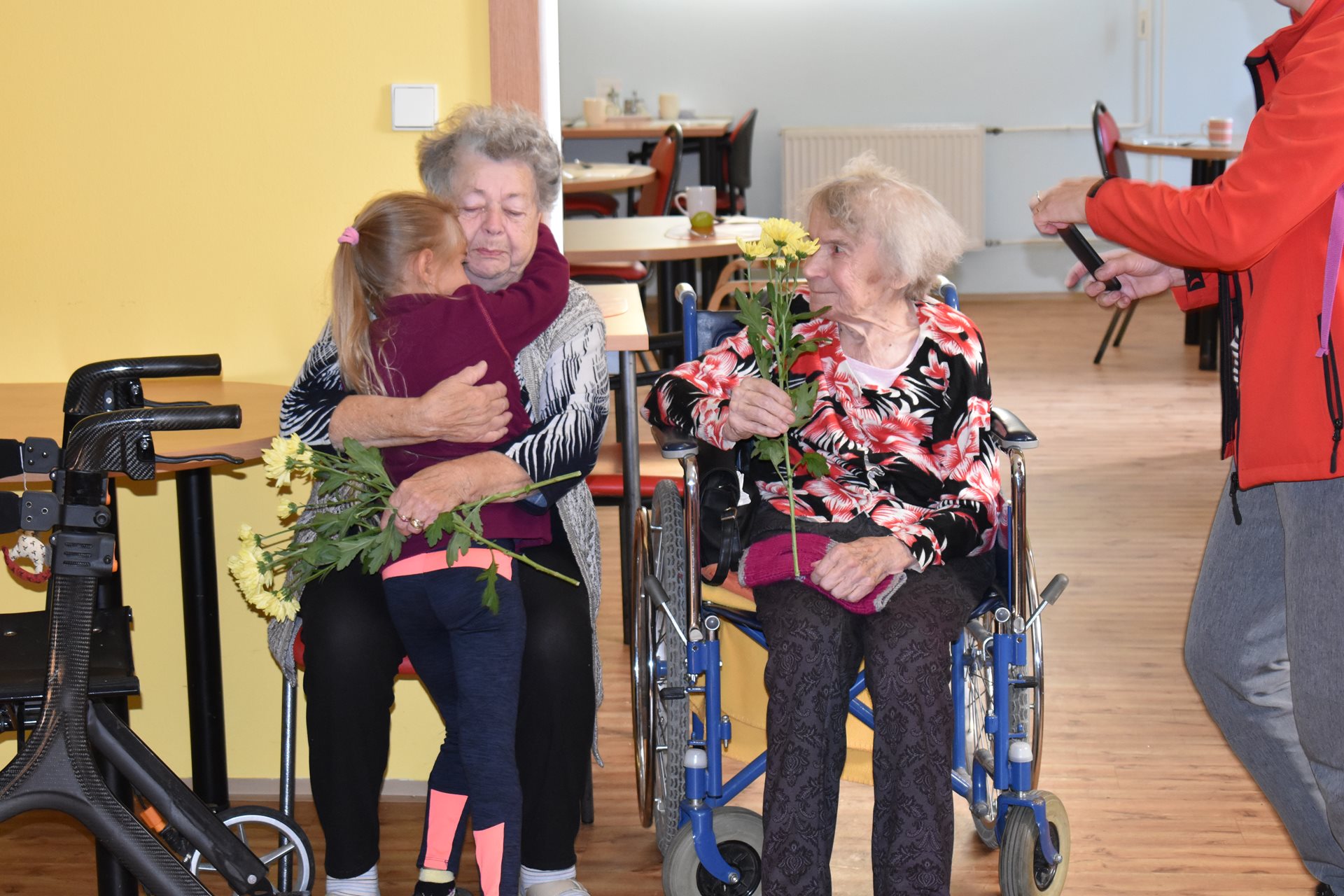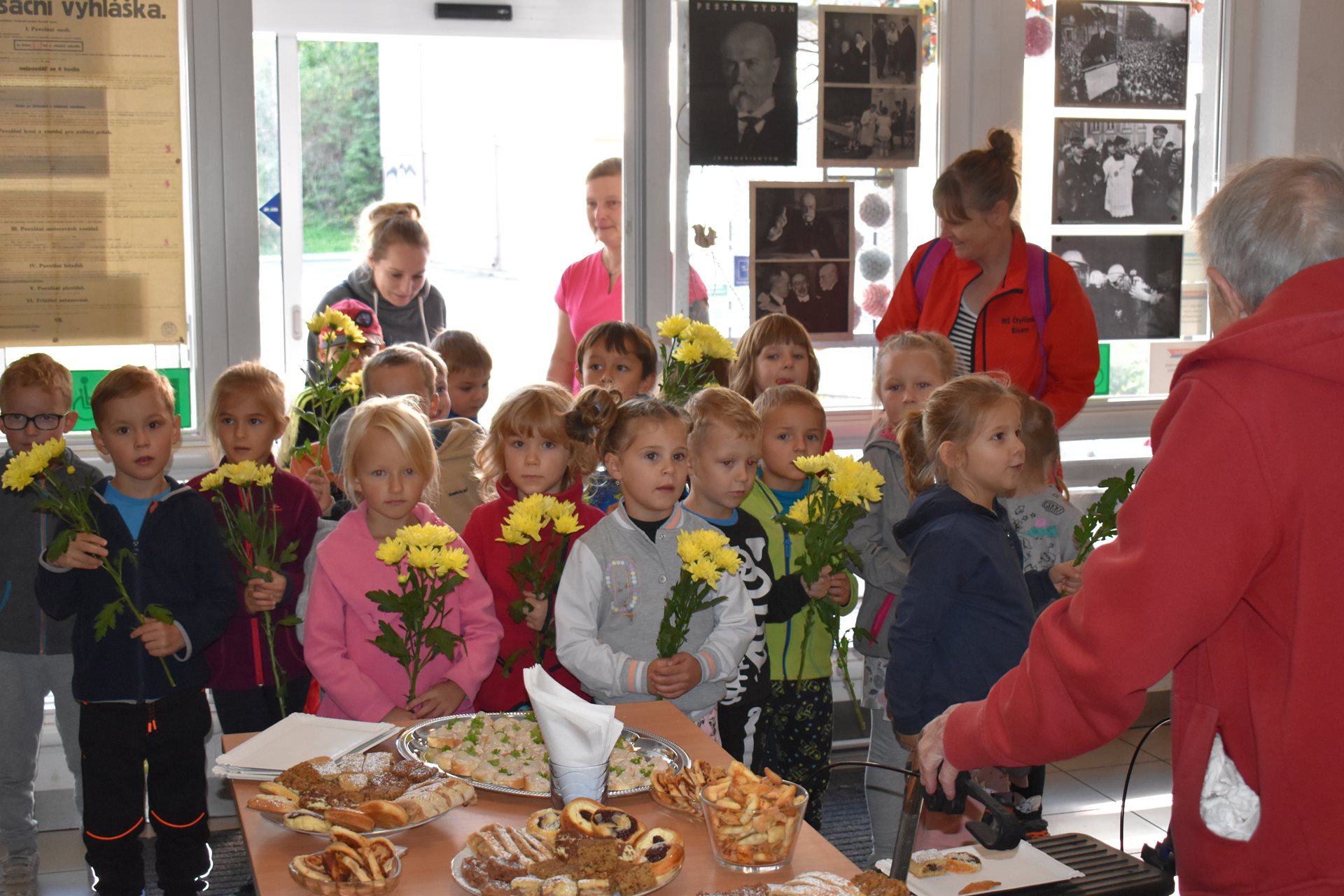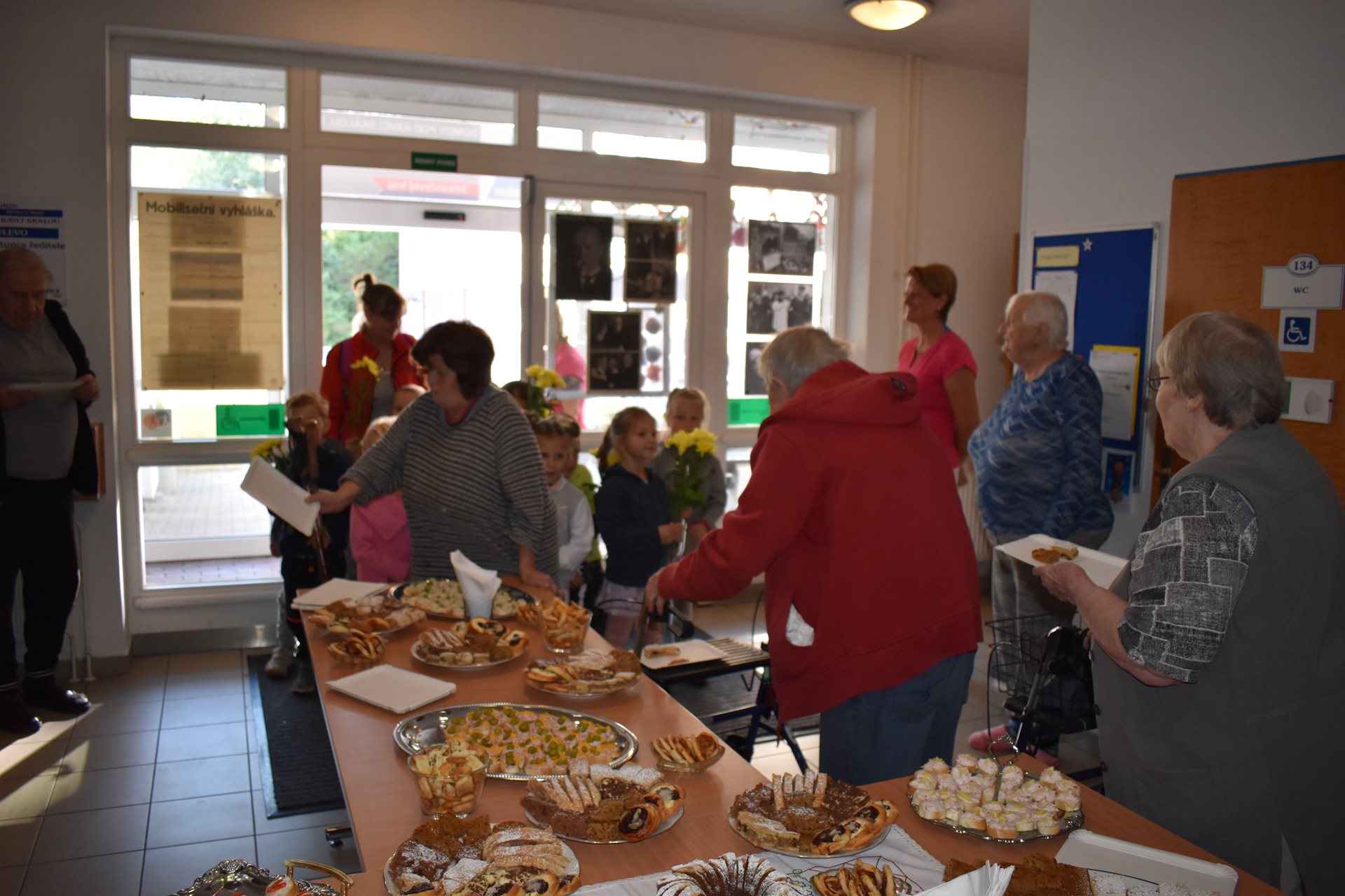 V pátek dopoledne jsme formou komorní vernisáže tuto výstavu otevřeli, pohoštění na vernisáž jsme připravili vlastními silami, sladké pečivo si obyvatelky napekly zcela samy. A těšily se myšlenkou, že mohou na slavnostní zahájení takto přispět. Pochutnali jsme si, společně zavzpomínali a pak nás navštívila paní učitelka Jana Michaličková se svou třídou Zajíčků a přinesla nám kytičkové pozdravy. My jsme na oplátku dětem na staré promítačce pustili Červenou Karkulku a ukázali jim, jak se to dělalo "tenkrát". Bylo nám společně moc hezky.